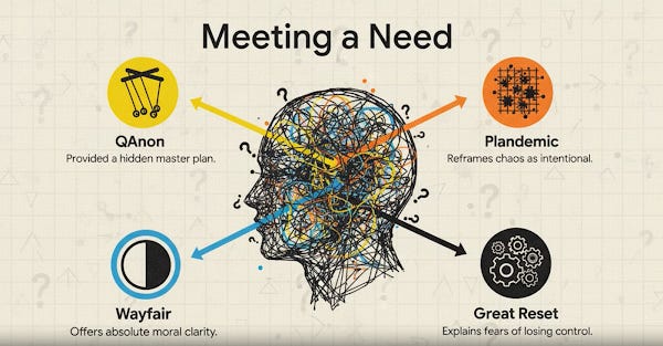 When the foundations of ordinary reality become uncertain, conspiracy theories function not primarily as explanatory frameworks but as meaning-stabilization systems. They provide what the fractured post-2020 world can no longer reliably supply: temporal structure, moral clarity, a sense of agency, community belonging, coherent identity, and purpose. Each major cluster of 2020-era conspiracy theories addressed specific dimensions of the existential crisis, offering remedies—however illusory—for particular forms of destabilization. To understand this ecology, we must examine not just what these theories claimed but what needs they met and how they intensified the liminal condition they purported to resolve.