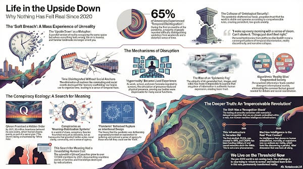 These overlapping ontological disruptions—the exposure of social reality’s contingency, the migration of presence into simulation, the destabilization of authentic expression—created fertile ground for alternative explanatory frameworks to flourish. When the basic coordinates of reality become uncertain, meaning systems that promise to restore coherence become deeply attractive. This is the context in which we must understand the conspiracy ecology that bloomed after 2020: not as random delusion, but as systematic attempts to rebuild ontological security in a world where the foundations had cracked. The Upside Down of post-2020 reality is not defined by any single feature—not by disease, not by political conflict, not by technological change—but by the collapse of the background certainties that normally make coherent experience possible.