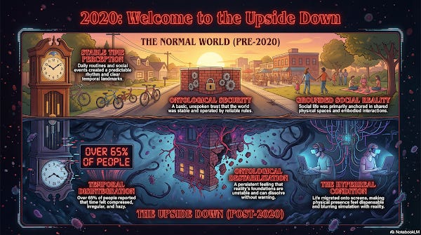 This ontological rupture created the conditions for what might be called “ambient unreality”—the persistent sense, reported by millions, that nothing feels quite real anymore. In the Stranger Things mythology, those who have been to the Upside Down retain a trace of that dimension even after returning. They can sense things others cannot; they remain connected to the breach. Similarly, those who passed through the threshold of 2020 emerged carrying what phenomenologists might call a “second sight”—an awareness that the apparent solidity of social reality is a construction that can dissolve without warning. This awareness, once gained, cannot be un-gained. It persists as a low-grade ontological anxiety, a perpetual recognition that the ground beneath one’s feet is less stable than it once appeared.