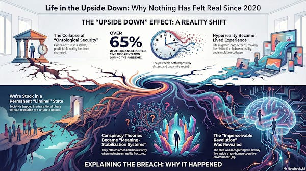 A viral YouTube video from June 2024 titled “Why Nothing Has Felt Real Since 2020” crystallized this sentiment for millions: “As of the time I’m recording this video it’s now been 4 years since we were locked inside and forced to interact with each other through our screens and ever since then there’s a large consensus specifically from young people that time has sped up significantly and nothing feels very real anymore.” The video analyzed how “the lockdowns compressed the perception of time due to the extreme monotony of our daily routines during the lockdown none of us were really experiencing anything novel,” leaving participants with the sensation that they were perpetually “making up for lost time.” On Reddit, in a thread titled “Does anyone else not feel the same since 2020?” which accumulated hundreds of responses, one user wrote: “I haven’t been the same person ever since 2020. Before then, i used to always go out with friends look to do new things and i was generally outgoing and had a positive outlook and assumption of people. But after the pandemic happened I became much more lonely, not wanting to go out as much and have become much less outgoing and have had a negative outlook on life in general.” Another responded: “Felt like we hit a dimensional warp, times going faster, the world is more and more fucked up.” A third reported: “Since 2021 I wake up every morning with a sense of doom. Can’t shake it. Things just don’t feel right.”